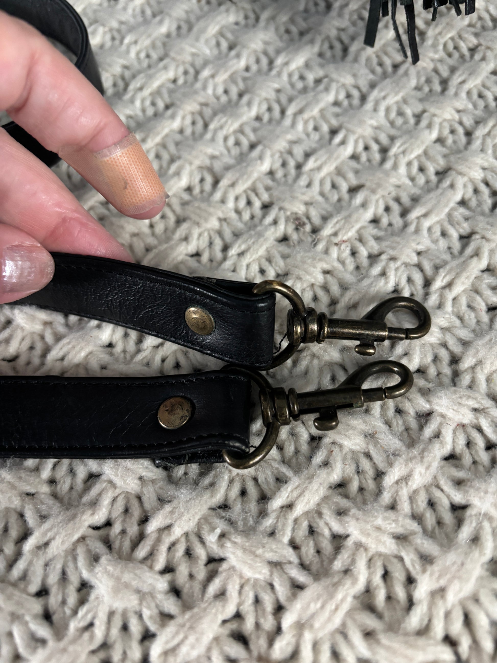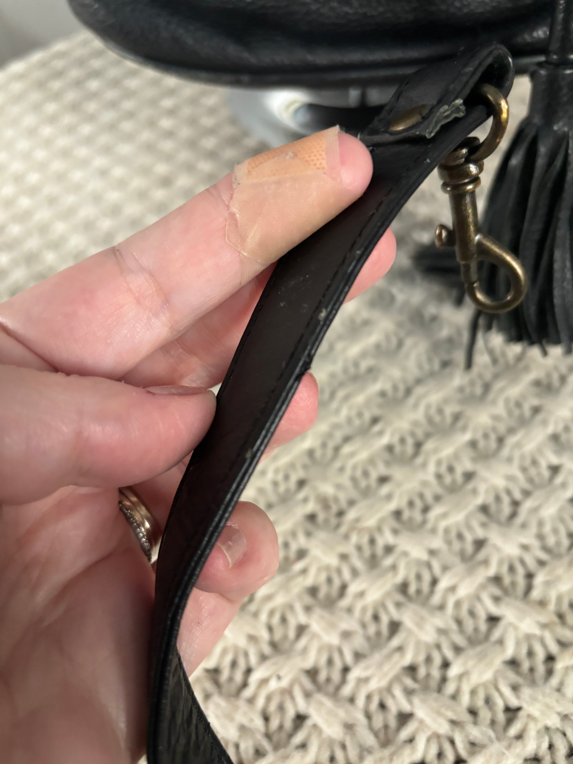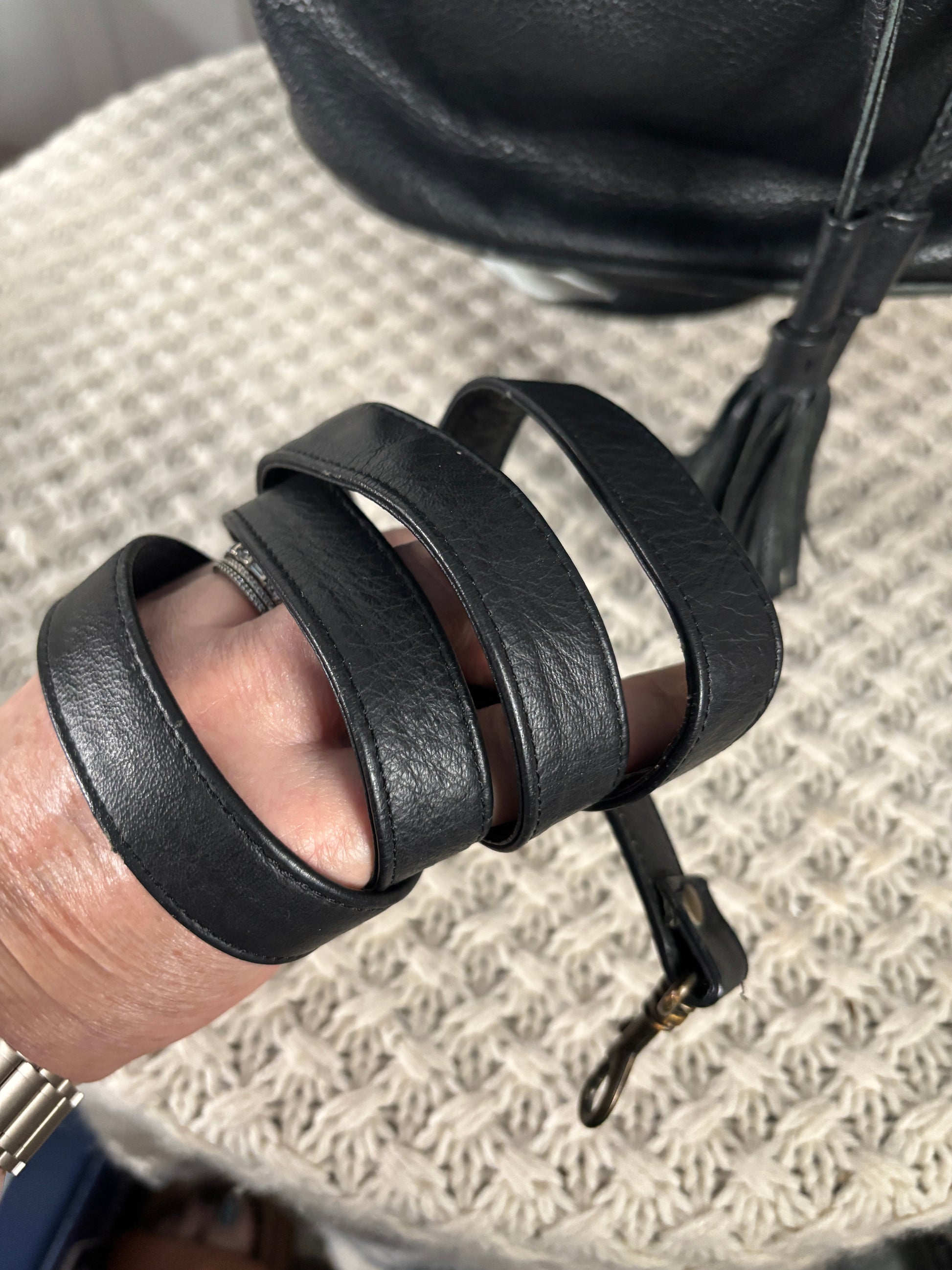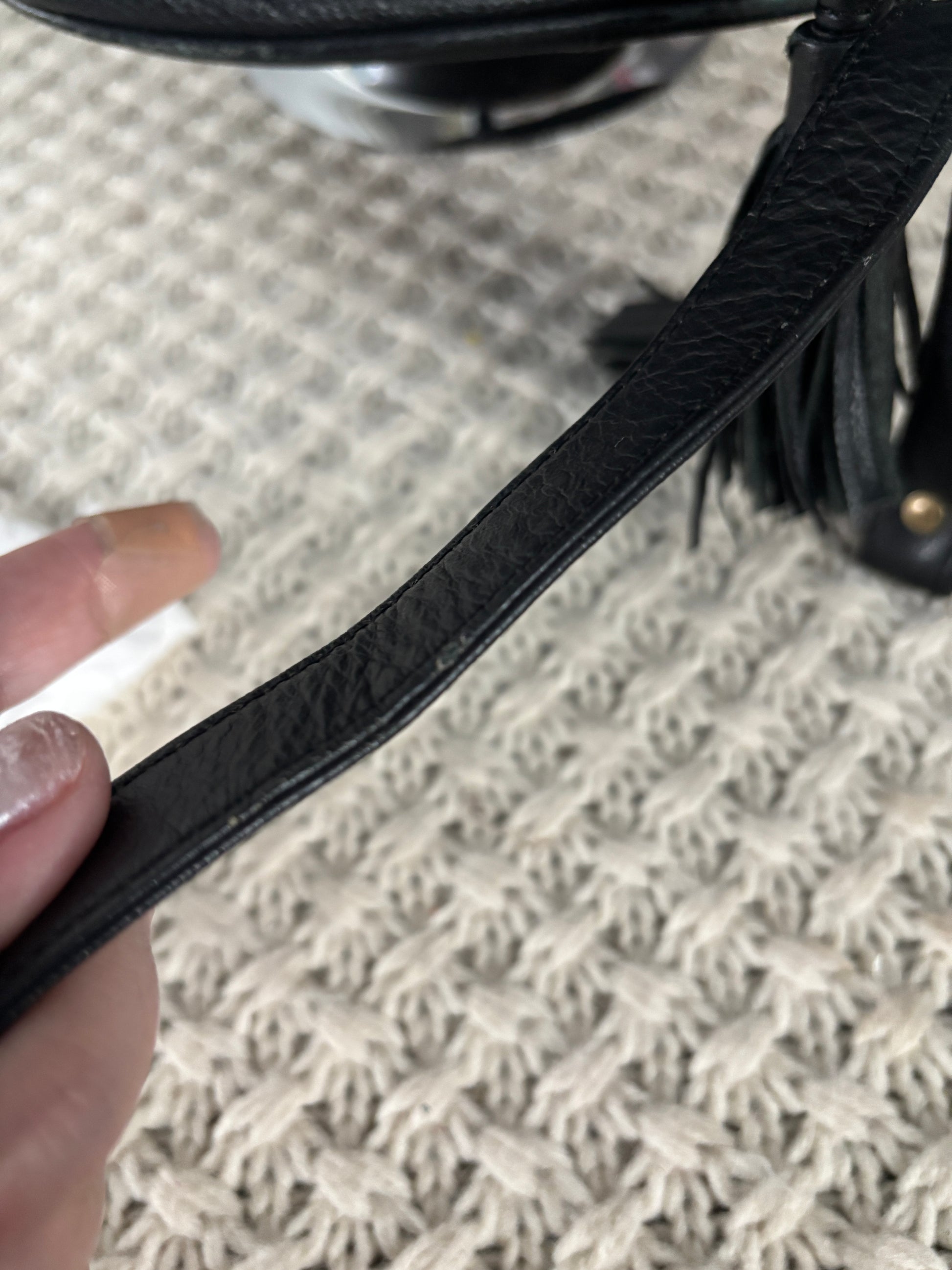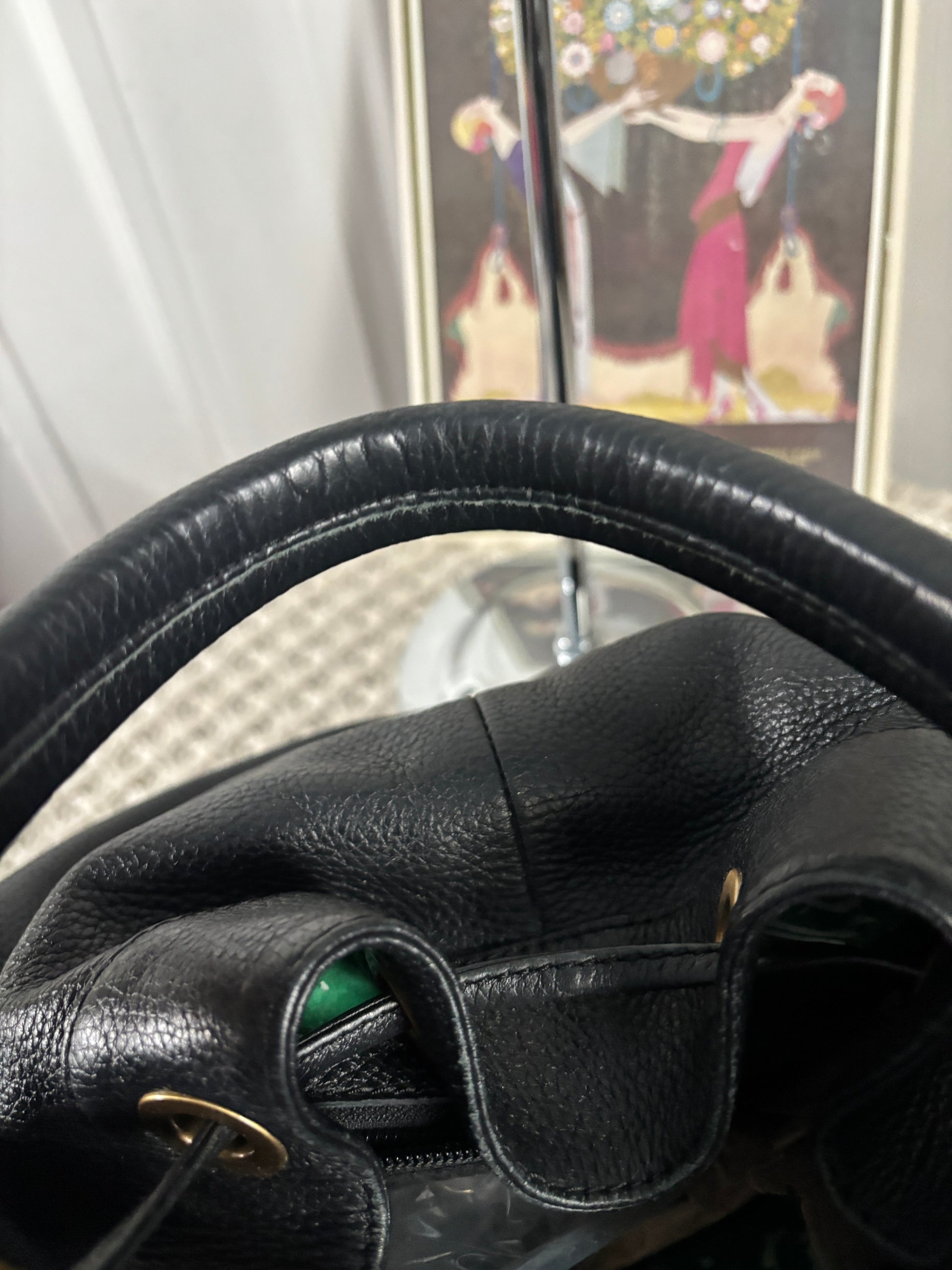 Great condition overall. It has wear on the bottom piping and the drawstring. The interior lining has some discoloration. The long strap has been replaced with a black leather (matching) non-original strap.
