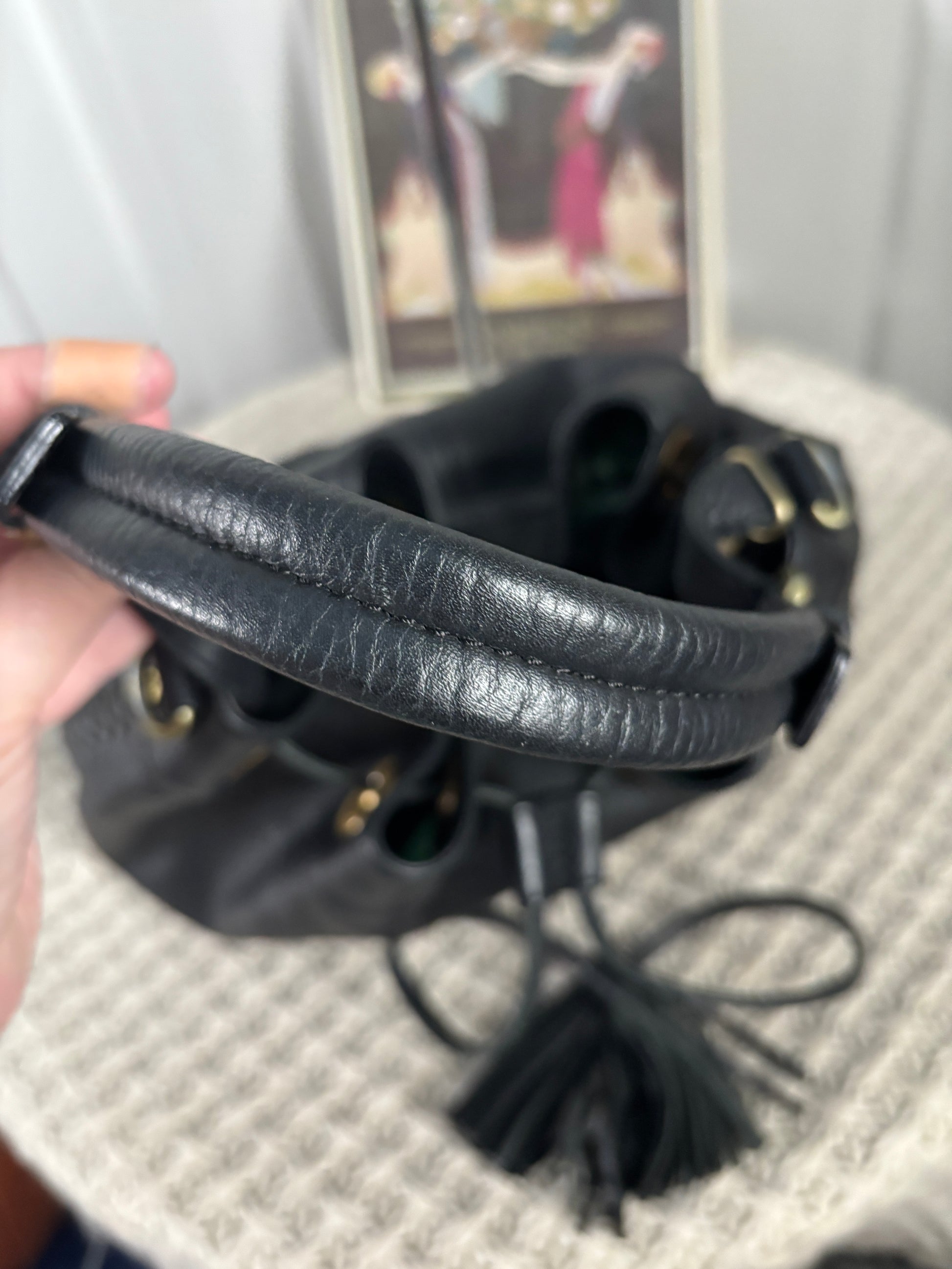 Boden leather drawstring bucket bag with brass tone hardware, leather drawstring with tassels, decorative stitching on the side, and green floral interior lining.